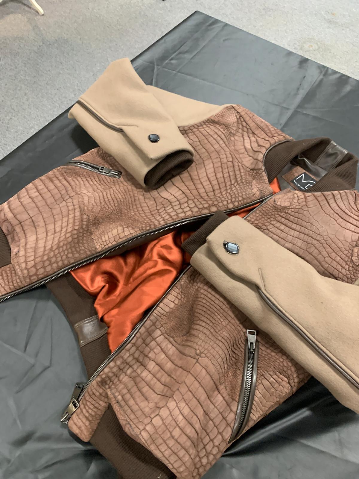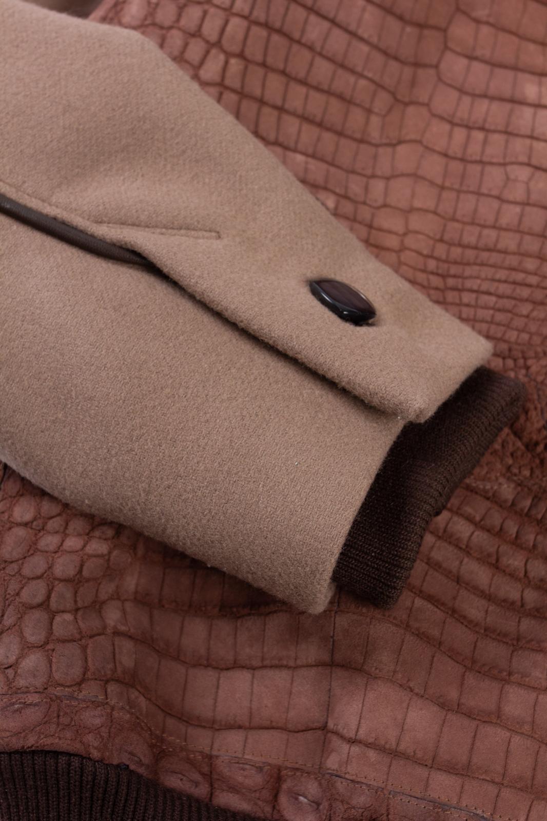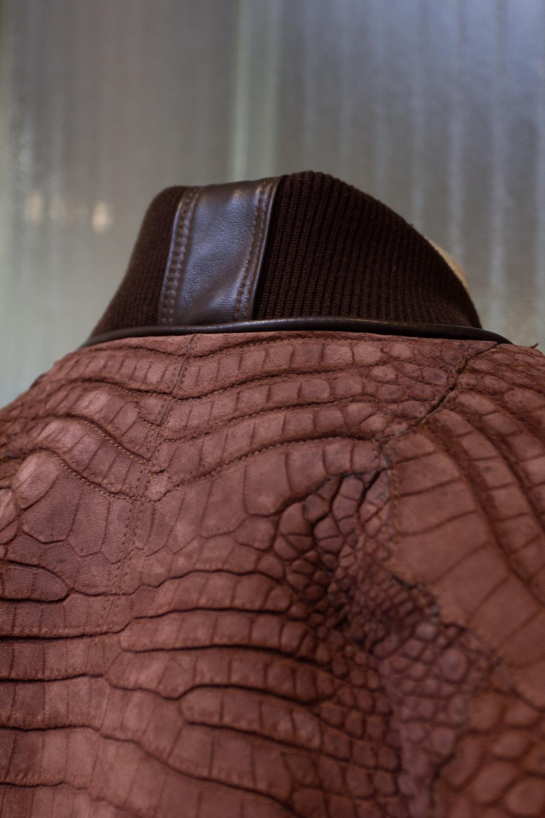 Varsity Teddy College Jacket, Cigar coloured Nubuck finish, 100% Croco skin. 100% silk lining and double Jersey Collar.